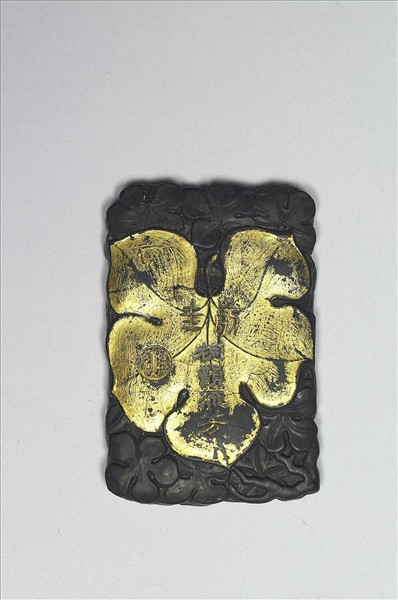 近長方形墨,墨色沉厚亮潤,面有裂紋。雙面皆雕桐葉,葉厚脈深線條流利。一面中央作一刷金大葉,其上做篆文「○圭」、隸文識款「桐韻流芳」與陽文篆印「燦君」;另一面填藍色題句「喧密葉於鳳晨,宿高枝於鸞暮」,鈐「東」、「山」填金雙連印。
