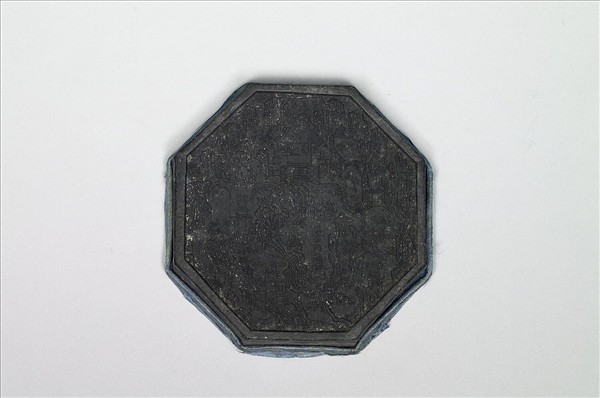 八角形墨,周起棱,有些微裂紋與霉點。一面直書「齊雲勝景」,戧金加框,一面模印江南名山白岳齊雲山山景圖,版模精細,山石建築特徵可見,且詳註名稱,極具賞玩紀念價值。墨側有款「方于魯製墨」。附紙座。