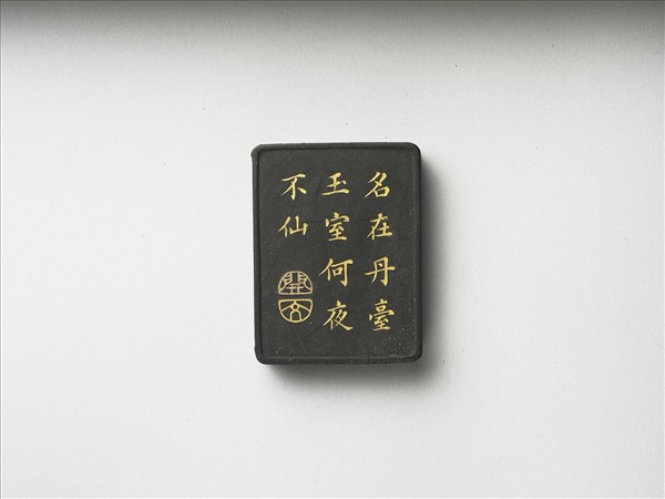 長方形墨,四角略圓,周起棱。一面模印老者杵杖閑步於山林石版橋邊,左方填金識「雲中畢世長」,另一面書填金詠詩「名在丹臺玉室何夜不仙」,鈐陽文篆文雙連章「開」、「文」。五老墨一套五件,共儲於雙龍戲珠漆盒。
