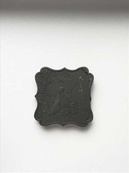 近正方形,緣作流線形連山紋,周起棱,邊角有裂傷及小剝損。一面模印奇石芭蕉,老者安坐其下,神態安詳,右方填金識「太原王漁」,另一面書填金詠詩「丹井芝田,供其嘯傲,松脂桂實,養厥性真」,鈐陽文篆印「蒼佩山人」。五老墨一套五件,共儲於雙龍戲朱漆盒。