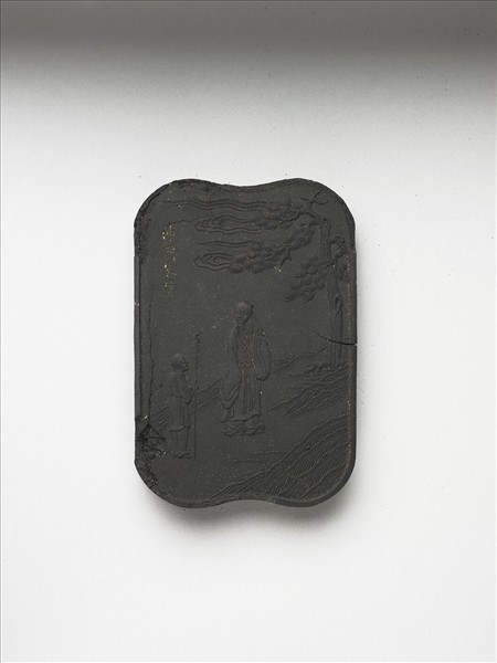近長方形,四角圓而二短邊內凹,周起棱,略有裂傷及剝落。一面模印老者閑立松木下,旁童子持杖侍立,左方填金識「沛國朱貫」,另一面書填金詠詩「集高年于商,雒會啟耆英,繪雅圖于香,山里各履道」,鈐陰文篆印「開文仿古」。五老墨一套五件,共儲於雙龍戲珠漆盒。