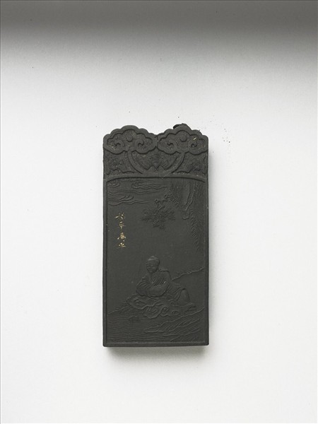 長方形墨,惟首部呈雙雲頭紋狀而稍似碑形,面皸裂金漆斑駁。墨首雙面俱作二如意雲頭紋,下有三蝠。一面模印老者臨水踞坐,手拱袖中作沉思狀,左方填金識「始平馮平」,另一面書填金詠詩「醉游春圃?霞暖,吟聽秋潭水石寒」,鈐橢圓陽文篆印「蒼佩室」。五老墨一套五件,共儲於雙龍戲珠漆盒。