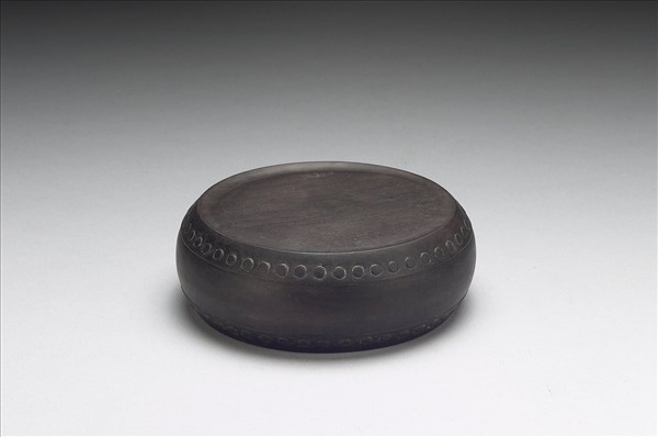 石硯,造型如圓鼓,腰凸而上下斂收,硯面周環渠為墨池。器底淺琢石鼓文。石鼓又稱「獵碣」,是中國現存最早的文字刻石,石鼓硯一套十件,每件各編號甲、乙、丙、丁、戊、己、庚、辛、壬、癸。乃仿其形制而成。石硯置金漆盒中,盒面亦書與硯底相同的銘文內容,盒內、外各有一錦墊。