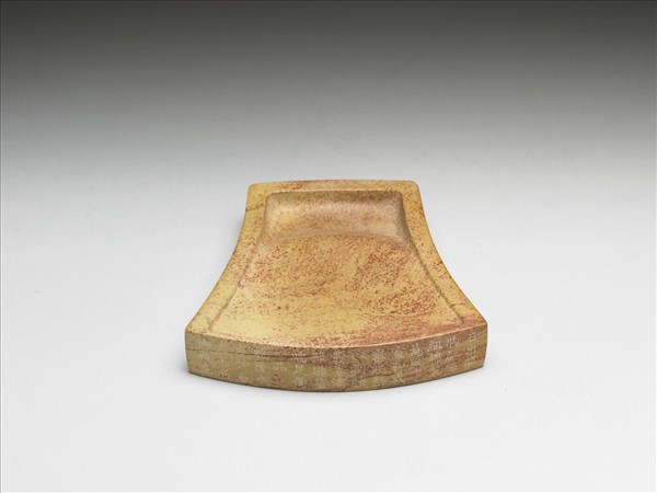 《西清硯譜》云為:「臨朐紅絲石」,硯琢風字形,上窄下寬,色黃,全硯滿佈紅絲斑紋,硯面寬平,受墨處緩緩斜下而成墨池,硯背平整,硯下方壁鐫清高宗御題詩乙首,楷書:「石出臨朐,紅絲組錦,製為風字,宣和式審,既堅以潤,腴發墨瀋,雖遜舊端,足備一品。」款題:「乾隆戊戌仲春月上瀚御題」。鈐印一:「太璞」,按此御製硯銘亦著錄於《清高宗御製詩文全集一》,《御製文二集》,卷三十九,頁六。「乾隆戊戌」為清乾隆四十三年,西元1778年。