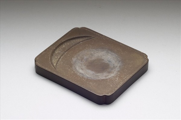 澄泥硯,色褐黃。器近正方形,四角有折,周沿及墨池起棱,墨池作偃月形,受墨處略凹有使用痕。硯背鐫清高宗御銘:「絳縣得材偶倣古,餘製二硯硯匣貯,臨池五合之一助,逮憶蘇言意則憮。乾隆丙申御銘(四十一年,1776)」,並鈐「朗潤」。根據《西清硯譜》記載,與相同形制澄泥硃硯二方合貯一匣。