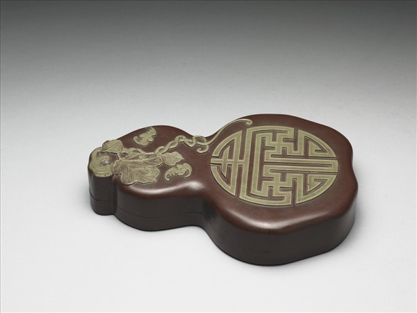 紫色蒲蘆形硯盒,盒用紫綠兩層色石巧雕而成,上半部雕瓜之藤蔓與三葉,一仰二覆,前者陰刻葉脈,後者浮雕脈紋,左右二隻蝙蝠翔於葉下;盒下半部浮雕卍壽團紋。蓋面紋飾寓意「福壽萬年」。盒背周緣起寬棱,並有一層褐黃色塗料。