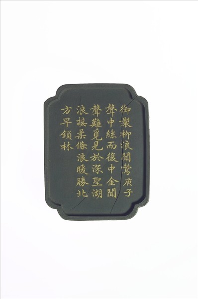 正四邊形墨綠色墨,四角內凹,邊框起棱。一面有填金楷書乾隆詩作:「御製柳浪聞鶯,庚子(乾隆四十五年,1780)。聲中絲而復中金,聞聲難覓見於深,聖湖浪接柔條浪,暖勝北方早鎖林。」另一面則模印屋舍景觀,據乾隆詩作可知該圖為描繪西湖名景「柳浪聞鶯」者。墨側有「乾隆年製」楷款。此墨與其他九塊色墨各自表現西湖一景,而成一套「西湖十景」套墨,俱同儲於一盒。