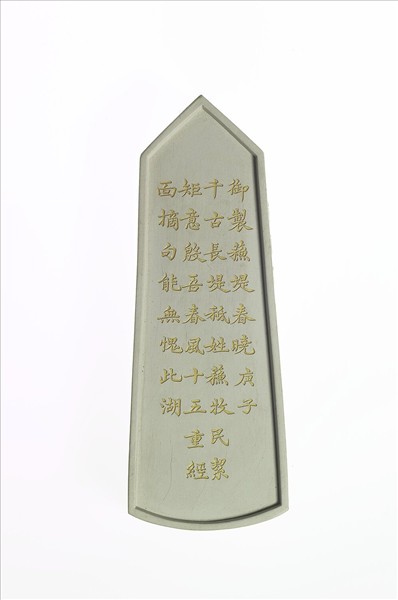 尖首圭形白色墨,邊框起棱。一面有填金楷書乾隆詩作:「御製蘇堤春曉,庚子。千古長堤祇姓蘇,牧民絜矩意殷吾,春風十五重經面,摘句能無愧此湖。」另一面則模印屋舍景觀,據乾隆詩作可知該圖為描繪西湖名景「蘇堤春曉」者。墨側有「乾隆年製」楷款。此墨與其他九塊色墨各自表現西湖一景,而成一套「西湖十景」套墨,俱同儲於一盒。