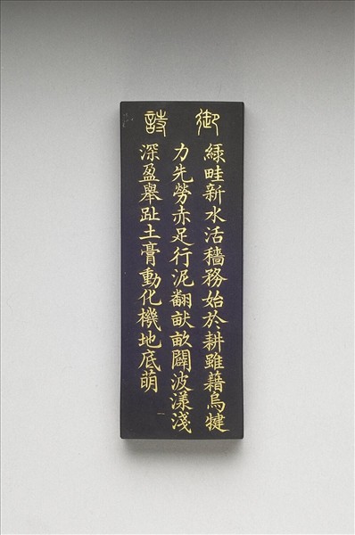 長方形墨,色深黝細膩。一面模印老者稚童散步阡陌間,遠觀農人役牛耘田,旁金書「耕」。另一面漱金題「御詩。綠畦新水活,穡務始於耕,雖藉烏犍力,先勞赤足行,泥翻畎畝闢,波漾淺深盈,舉趾土膏動,化機地底萌。」御製耕圖詩墨一套二十四件,共收於雙龍「御製耕圖詩墨」漆盒,並有錦袱。