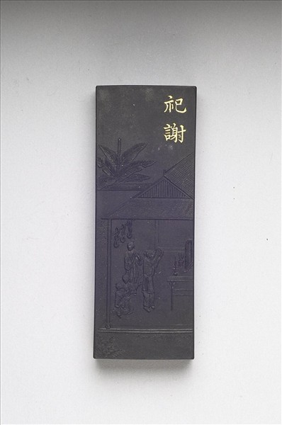 長方形墨。一面模印填金楷字「祀謝」,並模印蠶農祭神以謝蠶事豐順之象,就中人或跪或立,皆拱手禱拜。另一面漱金題:「御詩。蠶成申報祀,虔謝望豐穰,天駟輝騰迥,西陵澤衍長,香昇陳滿几,絲獻祝盈箱,衣被免寒凍,抒誠遍里鄉。」御製織圖詩墨一套二十四件,共收於雙龍「御製織圖詩墨」漆盒,並有錦袱。
