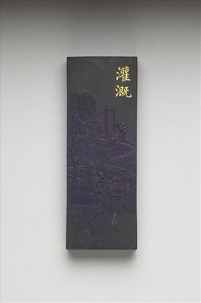 長方形墨。一面模印農人河邊踏水車引水,取水灌溉,旁金書「灌溉」。另一面漱金題「御詩。水利通溝洫,田功茂育加,桔橰流響逸,䆉稏漾芬賒,隔堰波翻影,盈疇浪叠花,踏歌忘力倦,桞外日西斜。」御製耕織圖詩墨一套二十四件,共收於雙龍「御製耕織圖詩墨」漆盒,並有錦袱。
