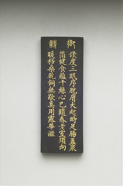 長方形墨。一面模印填金楷字「大起」,並模印屋舍庭樹,屋外有人提籃正欲進屋,屋內有一人正忙於蠶事,似正應付著蠶隻蛻皮「大起」的繁忙。另一面漱金題:「御詩。倏度三眠序,脱膚大起時,足腸盈衆箔,健食藴千絲,心已隨春老,室須向暖移,桑乾飼無歇,奚用露華滋。」御製織圖詩墨一套二十四件,共收於雙龍「御製織圖詩墨」漆盒,並有錦袱。