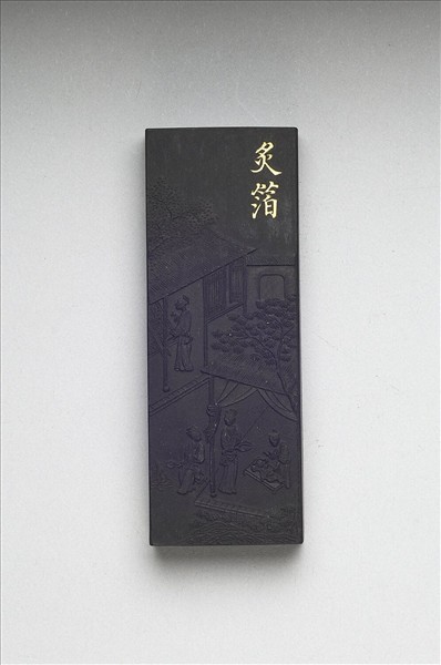 長方形墨。一面模印填金楷字「炙箔」,並模印屋舍庭樹與人物,左上之圖像表現調整蠶繭燥濕的景象,而下方則有一小兒調皮橫躺,戲作休閒之貌,增加此圖的趣味性與戲劇性。另一面漱金題:「御詩。隂寒釀梅雨,比戸下帷簾,箔上繭將作,爐頭炭漸添,含生緣避冷,本性豈趨炎,緩炙休過燥,功勤晝夜兼。」御製織圖詩墨一套二十四件,共收於雙龍「御製織圖詩墨」漆盒,並有錦袱。