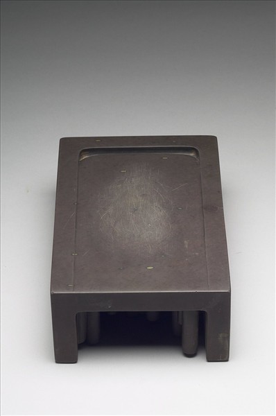 端石,硯作長方抄手式,下端無堵,傳為宋端溪梅花坑石,石質純正,石色紫而淡,通體青花,間有翠點,硯面平整,硯首墨池,窄長頗典雅,硯背有長短不一石柱,各有石眼,共六十四柱,恰合八卦重列之數,因名之四重卦硯,硯首壁面銅清高宗御題詩乙首,楷書:「奇偶八含八復重,卦成六十四為宗,由來天地自然數,豈有義文刱作蹤,刻柱令人明著眼,不言惟硯密藏胸,玩辭則置斯觀象,用者宜誰宜邵雍。」款題:「乾隆戊戌夏日御題」,鈐印二:「比德」、「朗潤」,按此詩收入《清高宗御製詩文全集》八,《御製詩》四集,卷五十八,頁四。按「戊戌」為清乾隆四十三年,西元1778年。