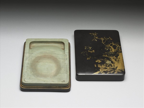 綠色方形硯,瓶形硯面,周邊起棱。ㄇ形池,池周邊棱較寬。石質潤澤,通體有深淺不同之綠色天然橫紋。硯面留有硃墨二色遺痕,池內亦同,硯背則尚留似洋紅之紅色顏料。硯背周邊起棱,中央凹下處陰刻行書銘:「以靜為用,是以永年。」並陰刻二行四字篆體方印:「雍正年製」。方形描金漆盒,子母口,四隅圓弧,盒背周緣起寬棱,四隅各有一 L形足。蓋面繪寫生菊花、牡丹、槴子花、小草與坡石,先以漆繪後貼金箔,並鎗刻花、葉脈紋與坡石皴紋;今多處金箔已剝落:菊花已漫漶不清,牡丹花與滬子花只留金箔殘痕,其葉亦多處斑駁。子母口緣尚有金漆殘痕,盒內所留紅色顏料遺痕甚濃。