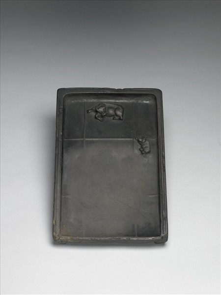 端石,硯作長方抄手式,下端無堵,兩跗較矮,色紫而淡,硯面平直,浮雕四直線而成井字形,硯堂微窪下,墨池約佔硯面三分之一,墨池間刻大小臥牛各一,大者在中央,小者在右側,兩相遙視,神態宛然,硯首上方側壁鐫:「宋硯」隸書二字,硯壁右側刻:「方井」二字隸書,硯背鐫清高宗御題硯銘乙首,行書:「冽寒泉、潤嘉穎,立體於靜,福曰斯永,養而不窮者,井也。」款題:「乾隆御識」,鈐印一「乾」、「隆」連珠印。此硯銘亦著錄《清高宗御製詩文全集一》,《御製文初集》,卷二十七,頁六-七。按此硯係乾隆十四年(1749)冬,乾隆帝於內府,襲古硯擇材良所製古十硯中第九方,所以在硯匣內標識「壬」楷書似有別於他硯者。