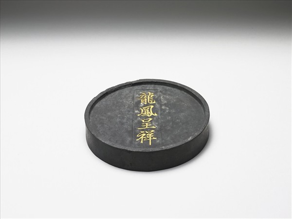 圓形墨,邊框起棱。一面模印龍鳳相對飛舞於雲間。一面則凹有長方形開光,開光中模印之「龍鳳呈祥」行書四字,應即喻指另面模印之龍鳳圖像。墨側有「程君房造」四字楷款。此墨與其他八墨同儲於一盒。