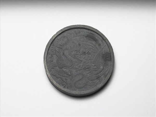 圓形墨,邊框起棱。一面模印龍鳳相對飛舞於雲間。一面則凹有長方形開光,開光中模印之「龍鳳呈祥」行書四字,應即喻指另面模印之龍鳳圖像。墨側有「程君房造」四字楷款。此墨與其他八墨同儲於一盒。
