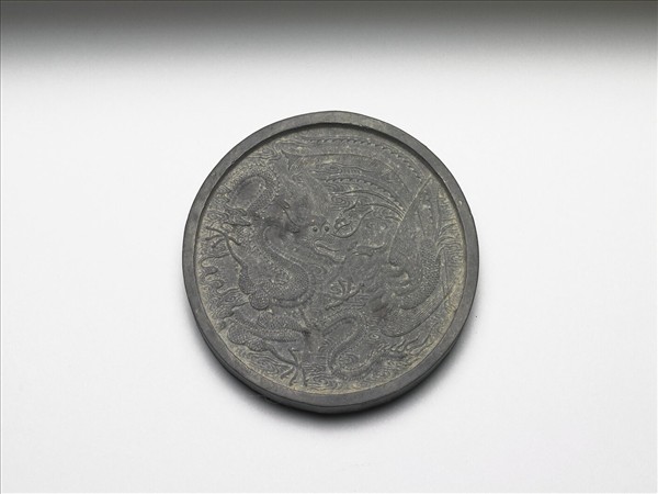 圓形墨,邊框起棱。一面模印龍鳳相對飛舞於雲間。一面則凹有長方形開光,開光中模印之「龍鳳呈祥」行書四字,應即喻指另面模印之龍鳳圖像。墨側有「程君房造」四字楷款。此墨與其他八墨同儲於一盒。