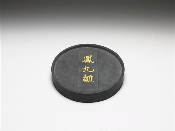 圓形墨,邊框起棱。一面模印山石林木,其間有鳳九隻。或坐或站,或正飛翔,姿態各自不同。一面則凹有長方形開光,開光中模印之「鳳九雛」楷書三字,應即喻指另面模印之九鳳圖像。墨側有「方于魯珍藏」五字楷款。此墨與其他八墨同儲於一盒。