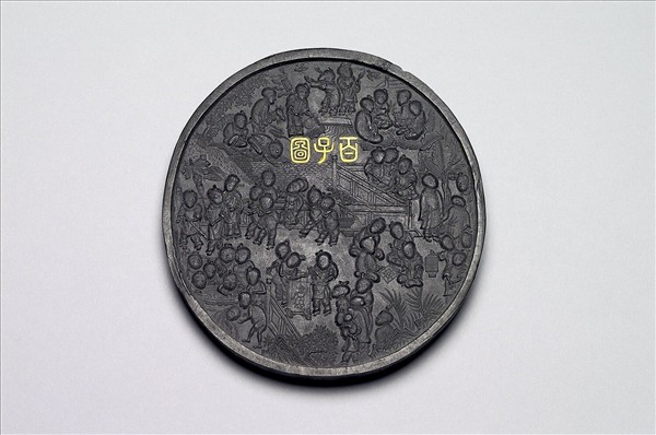 圓墨,邊框起棱。兩面均模印庭園中幼兒嬉耍百態,三兩成群,或玩傀儡、或據水採花撈魚、或坐地奕戲,幼兒與庭園造景滿飾墨面,展現了熱鬧歡愉的氣氛。其中一面有「百子圖」填金篆字,墨側模印有「程君房墨」、「萬曆丙午年造」(三十四年,1606)楷款。