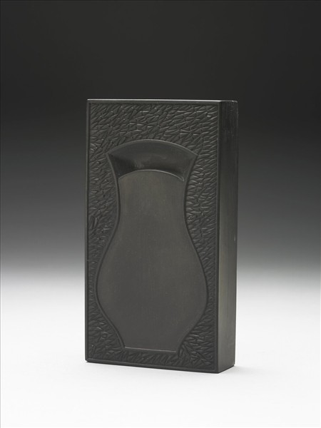 歙石,硯作長方形,硯面雕成瓶式,周環淺浮雕水草紋,瓶腹即是硯堂,而以瓶口為墨池,石色深墨,硯首壁側鐫楷書:「仿宋德壽殿犀紋硯」,八字。硯背平正,中鐫清高宗御題硯銘乙首,楷書:「硯研理,犀通靈,純蒼玉質為缾形,數其典兮德壽,興我懷兮守口。」款題:「乾隆御銘」,鈐印二:「幾暇怡情」、「得佳趣」。帶紫檀木盒,盒蓋面鐫:「仿宋德壽殿犀紋硯」八字。