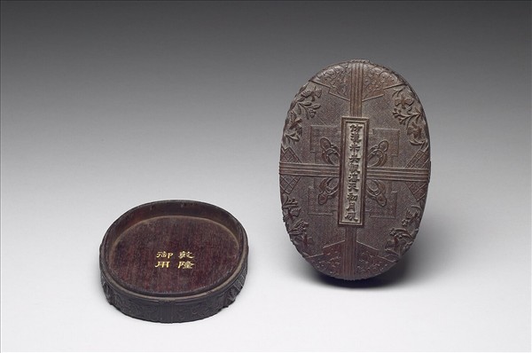 一罩式木盒內,盛放六件乾隆仿古硯:仿漢石渠閣瓦視、仿漢未央甎海天初月硯、仿宋德壽殿犀紋硯、仿宋天成風字硯、仿唐八稜澄泥硯、仿宋玉兔朝元硯。硯式皆取自明代高濂《遵生八牋》中所列的硯圖。六硯又各收在紫檀小硯盒內。這六個小硯盒外表細雕錦地花鳥圖案,極工緻細膩,規整費時,又表現了乾隆朝宮廷風格的另一面。