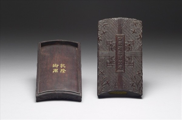 一罩式木盒內,盛放六件乾隆仿古硯:仿漢石渠閣瓦視、仿漢未央甎海天初月硯、仿宋德壽殿犀紋硯、仿宋天成風字硯、仿唐八稜澄泥硯、仿宋玉兔朝元硯。硯式皆取自明代高濂《遵生八牋》中所列的硯圖。六硯又各收在紫檀小硯盒內。這六個小硯盒外表細雕錦地花鳥圖案,極工緻細膩,規整費時,又表現了乾隆朝宮廷風格的另一面。
