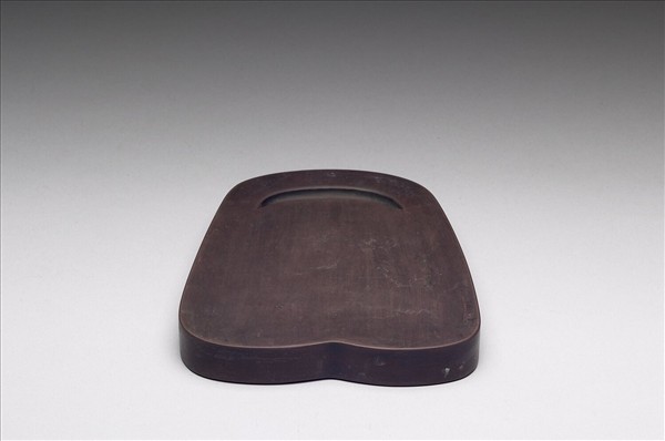 歙石,硯作風字形,呈平板狀,硯面平正,上方墨池作偃月形,光素無紋飾,石色紫中泛紅,硯首壁側刻楷書:「仿宋天成風字硯」七字,硯背平滑,中鐫清高宗御題硯銘乙首,楷書:「大塊噫氣其名曰風,天成取象製此陶泓,綈凡批諾綸綍成君子之德愓予衷,敢曰萬方無不從。」款題:「乾隆御銘」,鈐印三:「含輝」、「會心不遠」、「德充符」。帶紫檀木盒,盒蓋面鐫「仿宋天成風字硯」七字楷書。
