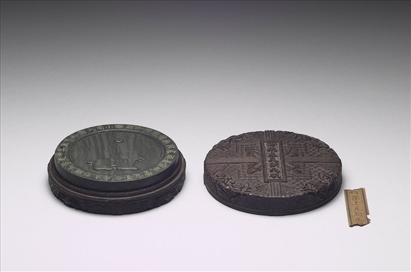 歙石,硯作圓形,以弦紋相圍而成硯堂,無墨池,石色黑,有羅紋刷絲及眉子細紋,硯首壁側刻:「仿宋玉兔朝元硯」,楷書七字,硯背亦以弦紋一道相圍,中刻一輪明月照大地,一兔作回首望月之狀,周緣鐫清高宗御題硯銘乙首,楷書:「小圓大圓如月盈,其中更孕玉䨲形,文房受墨宜管城,宣毫顧處能無情。」款題:「乾隆御銘」,鈐印一:「會心不遠」。帶紫檀木盒一,盒蓋面刻:「仿宋玉兔朝元硯」七字。