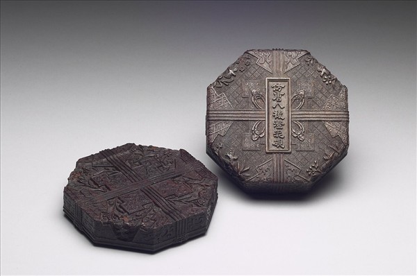 一罩式木盒內,盛放六件乾隆仿古硯:仿漢石渠閣瓦視、仿漢未央甎海天初月硯、仿宋德壽殿犀紋硯、仿宋天成風字硯、仿唐八稜澄泥硯、仿宋玉兔朝元硯。硯式皆取自明代高濂《遵生八牋》中所列的硯圖。六硯又各收在紫檀小硯盒內。這六個小硯盒外表細雕錦地花鳥圖案,極工緻細膩,規整費時,又表現了乾隆朝宮廷風格的另一面。