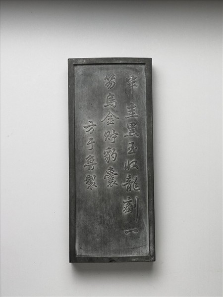 長方大墨。一面模印五種鳥類棲息於樹石河灘的情形,以示五鳥敘倫之教化意義。一面為陽文行書︰「半圭黑玉收龍劑,一笏烏金貯豹囊。方于魯製。」「五鳥敘倫」墨樣,見於程、方二氏的墨書,乾隆宮廷亦以之製墨。《方氏墨譜》所見為丁雲鵬繪稿的正方墨,本墨大致依之,但構圖因長方墨而略做變更。明清所製的大墨及裝飾性墨甚多,此墨大而厚,且脫模不慎之遺痕明顯,與方于魯墨中的精品相去甚遠。