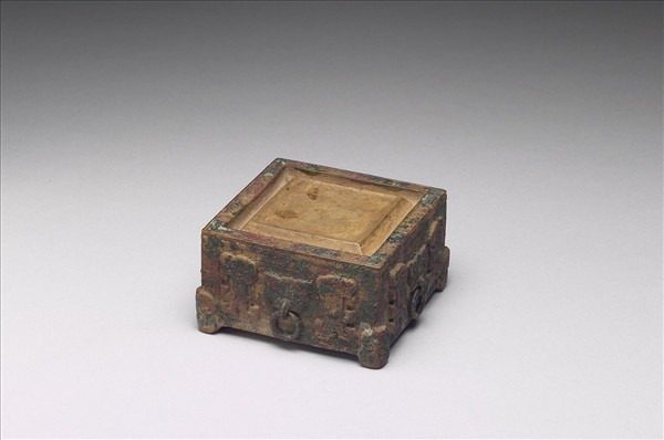 方形陶質硯,淺棕色,除硯面外,刻意作暗紅色與銹綠色佈滿全器,硯堂作正方形,居硯面正中,溝槽圍外;硯身以回紋為地,硯側四面雕銜環獸首,旁各有螭獸二。底有四足,底心陰刻楷款「大清乾隆仿古」,側圍刻識文一圈「螭為子,虎其變,象大人,合成硯。綈几絲綸出朵殿,勅幾省成慎宵旰,古訓是式遑耽玩。乾隆御銘」,並刻印「古香」。有同識文木盒一。