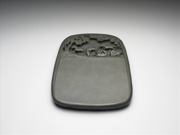 梯形石硯,上窄下寬周沿略圓,色墨綠。周起邊框,硯池高浮雕五馬,在水邊或坐或站,或食水草或休憩,旁有路石大樹與雲氣,熱鬧活潑。背無款識,但貼有光緒三十年(1904)進貢黃籤一張。