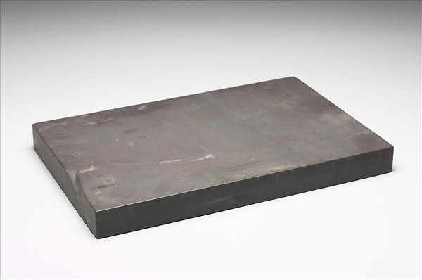 長方形硯板,色紫黑略有白色斑紋。全器方整不見任何雕飾,展現極簡端凝的風格,惟一窄端中央有三角形缺角。有木硯盒附件。