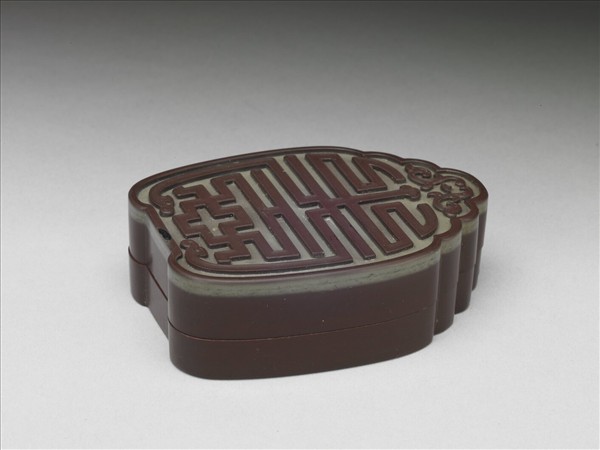 紫色如意首形硯盒,盒蓋與盒身藉硯身扣合。盒用紫綠兩層色石琢製而成,盒呈紫色。蓋面紋飾以暗綠色為地,側視有一圈暗綠色層,似青玉帶;巧雕紫色紋飾,周緣雕一細棱,中央浮雕壽字,其下方雕二卍字,盒上緣雕飾二回首龍紋。盒背周緣起棱。