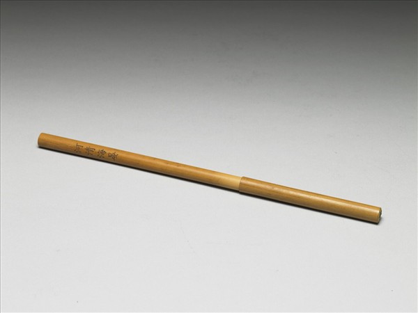 毛筆,筆管、筆蓋均為竹質,筆管自首至尾寬度皆同,其上並刻有「海清河晏」楷字,筆毛似以較軟之白色羊毫內覆健毫,筆性應較接近兼毫。另筆尖有些許紅色,應是使用痕跡。