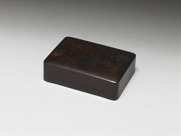長方木盒,深褐色,四足,外壁與盒蓋均光素無紋,內盛一長方硯。