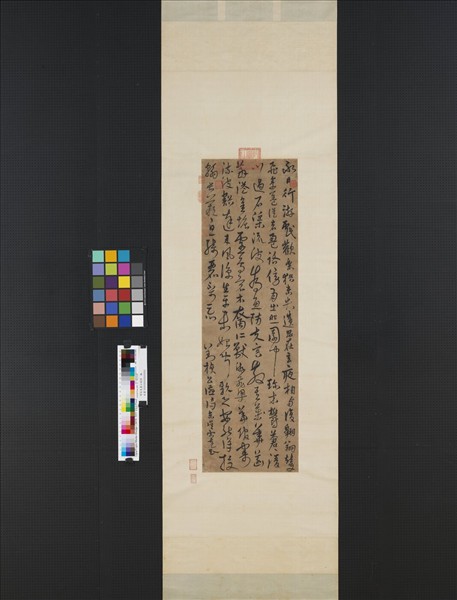 宋克(西元一三二七-一三八七年),江蘇蘇州人。字仲溫,號南宮生。年少性情豪放不羈,日久生厭而下決心閉門習書,日費千紙,終以善書名聞天下。其書出魏晉,深得鍾繇、王羲之筆法,又精研皇象急就章,將章草之質樸凝重改為放逸古雅,後世謂其書體法一變,脫盡元人風氣。為雲間書派開山祖師。此軸章草縱逸,隸書波磔用筆明顯,古雅雋秀。