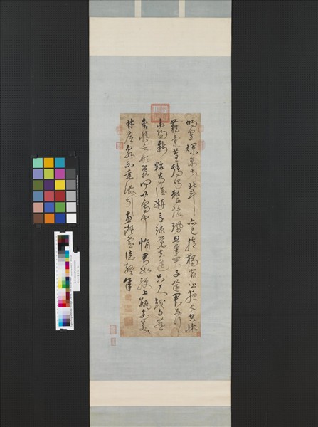 沈粲(1379-1453),字民望,號簡庵,華亭(今上海)人,與沈度合稱「二沈」。兄弟二人均因書法佳善,薦授中書舍人。沈粲行草書從二王得法,同時參取宋克和沈度的經驗,行筆偶或出鋒揚起波磔,別具飛動的態勢。這件立軸書錄元末明初詩人高啟「擬古詩」一首,點畫瘦勁,融會大草書的體勢,略與懷素狂草風格相近,由是可知,沈粲行草書原不止於一家之學。(20110913)