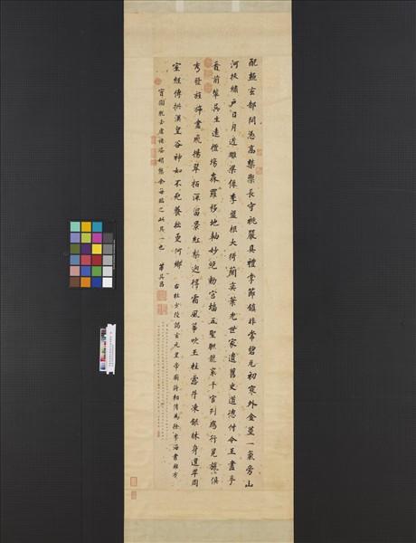 董其昌(西元一五五五-一六三六年),字玄宰,號思白,江蘇華亭人。萬曆十七年(一五八九)進士,官至禮部尚書,諡文敏。天才雋逸,善書畫,富收藏,尤精鑑賞。臨摹書蹟,至忘寢食。行楷之妙,稱絕一代。 本軸臨徐浩書杜甫謁玄元皇帝廟詩,董氏臨罷自題曰:「徐季海書雖方實圓,脫去虞褚姿媚態。」其用筆溫雅敦厚,字字肉豐而力沉,不特得徐浩之法,兼得歐顏之神。雖未署年,然以筆力之沉穩,與筆劃澀進抖動之態推斷,應為晚歲經意之作。