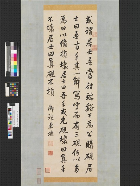 清高宗(西元一七一一-一七九九年) ,名愛新覺羅弘曆,雍正十三年即位,年號乾隆,在位六十年,文治武功皆頗有成就。天賦聰穎,詩書畫無一不能,又兼富收藏。 酷愛書法的清高宗,在聽政之暇常以翰墨自娛,晉唐以來書家多為其臨寫對象。本件清高宗雖以行書寫蘇軾〈硯銘〉,然而卻不見蘇軾特有的結字與豐腴的筆法,顯然是出於己意之作,仍可看出乾隆傳承自王羲之的書法風格。
