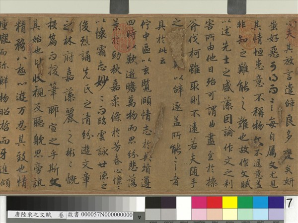 陸柬之(七世紀中葉)生平的事蹟相當簡略,《新唐書》記載他是陸元方(639-701)的伯父,虞世南(558-638)的外甥。活動年代是在唐太宗、高宗時期,官至朝散大夫守太子司儀郎。書學的師承出自舅父虞世南。全文書寫晉朝陸機(261-303)的文學名作〈文賦〉。把文賦讀成「美術賦」,那文句中的「籠天地於形內;挫萬物於筆端。」這用美術的形色來表達,更超過於用文字的文學來表現。文中有許多的文句也可以用來說明藝術,顯示文學與藝術本就是相通的。本幅由八段紙接成,行楷書相雜,偶而也有些許草書出現,共一四四行,除第一行標題「文賦」二字,末行三字,每行均作十一、二字,文字書寫中,如「才」作「材」、「山」作「ㄩ」是避家諱,「淵」作「水」,「世」作「廿」,是避唐高祖(李淵)、太宗(李世民)諱。原作上並無陸柬之款,被歸屬為陸柬之作,應該是出於卷後拖尾,趙孟頫(1254-1322)、李倜(活動於十三至十四世紀之際)等人的跋文所推定。從這些跋文與收傳印記,得知此卷經過趙孟頫鑑定,李倜收藏。洪武年間(1368-1398)一度流傳到滇南,後又回到江南,十五至十七世紀的流傳不明,這在董琰跋文中,提到明初從滇南購得此卷的相關人物均被刮去。十七世紀入孫承澤(1592-1676)手中,再傳入清內府,至今為故宮博物院所收藏。至於南宋以前的流傳經過,惜乎闕如,這也是某些研究者對本卷是否出於陸柬之之手,仍持存疑態度的原因。 陸柬之的書風,也是二王裔系。唐人評書,陸柬之的品級無法與虞、歐、褚並論,李嗣真(?-696)將他列入「中品十二人」之一,讚揚他「草體學虞,特善用筆」。〈文賦卷〉後方收藏人李倜,針對此卷說其筆法皆自〈蘭亭〉中來,有全體而不變者。孫承澤也說:「全摹褉帖〈蘭亭序〉,而帶有其舅永興(虞世南)之圓勁。」(見原件跋)〈文賦卷〉整體的丰神也是一派優雅,從容不迫的情懷,文長至一四四行,前後一致,比之〈蘭亭〉的行數,多了五倍,但從前到後筆調一致,不疾不徐,進退有度。文賦卷上恰巧也有「斯文」二字,「文」字的結體雖然不一樣,第一、二筆「、」與「一」,連成一筆,最後一筆「捺」為長點,然而書寫來,重筆濃墨的強調如出一轍。推而廣之,〈文賦卷〉也常有類似的情況,少則一、二字,如至「妙妙」而臨雲、天淵之「安」流、沈辭「拂」悅;多則如「峻,收百世之闕文」,和旁行比較,都因字體大而顯眼。