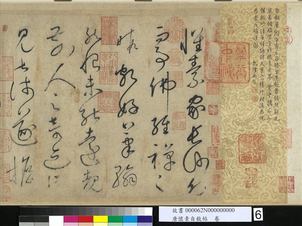 懷素(西元七二五-七七七年後),長沙人,後徙京兆。字藏真,俗姓錢,幼出家為僧,以草書擅名當時。 本幅全文自敘其平生事,款大曆丁巳(七七七),時五十三歲。懷素自敘,世有三本,一在石陽休家,一在馮當世家,一在蘇舜欽家,本卷即蘇氏所藏者。全卷筆法瘦硬圓勁,使筆飛動圓轉,如錐畫沙。