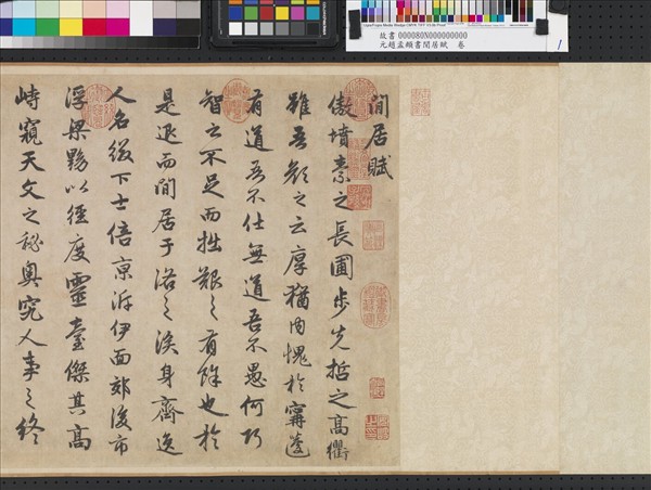 趙孟頫(西元一二五四-一三二二年),吳興人。字子昂,號松雪道人。宋亡,家居力學,侍御史程鉅夫奉詔搜訪遺逸,以孟頫入見。官至翰林學士承旨,封魏國公,諡文敏。孟頫詩文清遠,有松雪齋集行世。 宋之末年,書學不振,孟頫提倡復古,影響當代甚鉅。其書凡三變,初臨思陵,中年學鍾繇及羲獻,晚乃學李北海。閒居賦乃其晚年之作,結體整飭,行間疏朗,為深受李北海影響之作品。