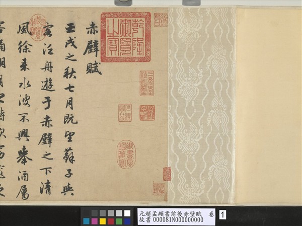 趙孟頫(西元一二五四-一三二二年),湖州(今浙江吳興)人。字子昂,自號松雪道人,也稱鷗波,宋太祖十一世孫。仕元,至翰林學士承旨,封魏國公,諡文敏。工書善畫,亦善刻印。書法倡復古,影響後世甚大。其書凡三變,初臨宋高宗,中學鍾繇及二王,晚學李北海。 本作兩賦分別描繪神宗元豐五年(1082)蘇軾兩次與友人乘舟夜遊赤壁,藉由懷古表達對宇宙及人生的看法。(20100102)