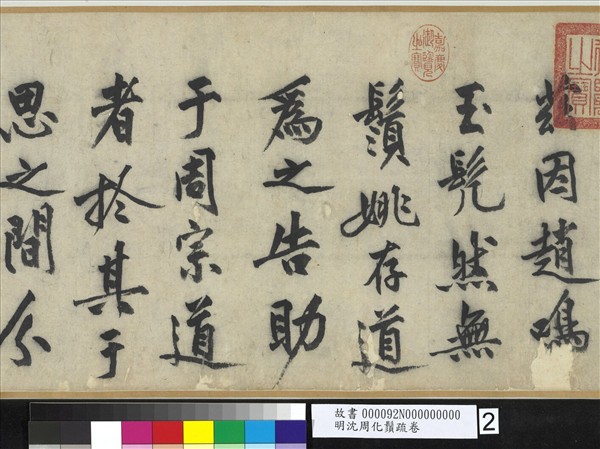 沈周(西元一四二七-一五0九年),長洲(江蘇蘇州)人。字啟南,號石田,自稱白石翁。為人寬厚有大度,能詩文,工書法,善繪畫。書法黃庭堅,遒勁奇崛。山水少承家法,凡宋元名手,皆能變化出入。 沈周的朋友趙鳴玉老而無鬚,另一位朋友姚存道為此求助於周宗道,請分鬚十莖給趙鳴玉,由沈周執筆為化募之文。該卷以行書大字寫成,筆法沉著穩健,體勢挺拔,縱橫舒展,與黃庭堅相似,風格渾厚,自成一格。(20091015)
