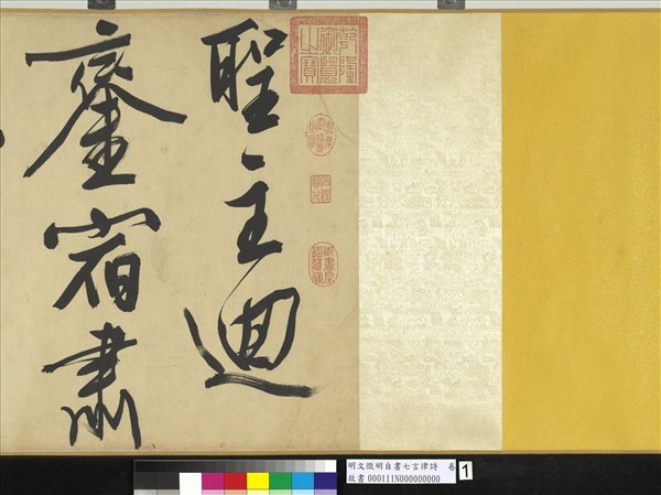 文徵明(西元一四七0至一五五九年),江蘇蘇州人。初名壁,四十二歲後以字行,改字徵仲,自號衡山居士。詩文書畫俱工,傳世書法以行草居多,論者謂其行筆得力於蘇(軾)、黃(庭堅)、米(芾)及「聖教序」,精通各體。 本幅文氏自書所作〈恭候大駕還自南郊〉七言律詩一首,收錄《甫田集》卷十,字大徑四寸,用筆勁健豪放,氣勢通貫全幅,結字筆法頗得黃山谷縱逸之氣。