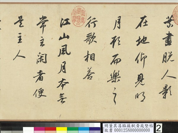 董其昌(1555-1636),字玄宰,江蘇松江(今上海)人。萬曆十七年進士,任官至南京禮部尚書。政事餘暇喜好書畫創作、論評和鑑藏,其書畫理論對後世影響尤其深遠。董氏論書法,以為「學書不從臨古入,必墮惡道」,其個人亦身體力行,臨寫古人書蹟不輟。此卷臨書以得蘇黃神采為重,適如董氏所云:「臨帖正不在形骸之似」,宜「觀其舉止笑語精神流露處。」(20110913)