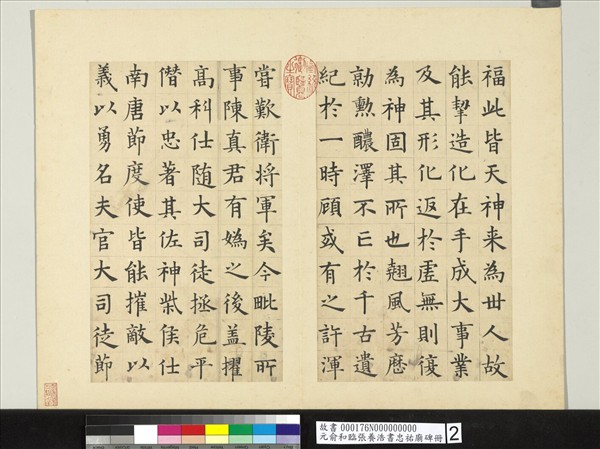 俞和(活動於一三四一-一三六八年),號紫芝老人,杭州人。廣臨晉唐諸帖,工夫極深,嘗見趙孟頫筆法,行草和趙作可以亂真,後人常以其字冒為趙書。 「忠佑廟碑」為元御史中丞張養浩書寫,立於杭州,廟中供祀隋時郡人陳杲仁及南唐將軍柴克弘。俞和臨寫此碑,可看出歐陽詢對元代楷書的影響,俞寫歐體,乍看神似,只是歐字筆力險峻,俞字卻清秀沖和,不再有北碑森嚴的氣息。